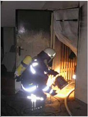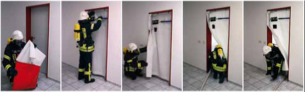 The portable smoke blocker prevents the spread of smoke and heat in not affected areas of burning buildings. With the easily operated tension lever the portable smoke blocker can be fast installed into a door or entrance opening. The door to the affected area can be opened now and the fire fighters can enter the room behind for their operations without the spread of smoke and heat in the building. The stairways can be ventilated with positive pressure ventilation without streaming in of additional smoke from the burning areas. Escape routes for the residents and retreat ways for the fire fighters stay smoke-free. It is possible for the security backup to stay close to the attacking fire fighters. The time for the rescue operation in case of a breathing protection emergency is considerable reduced. Dangerous situations through smoke and heat spread are effectively minimized or avoided. When the smoke stopper is inserted to a door frame the fire fighters can enter the burning room without any problems.